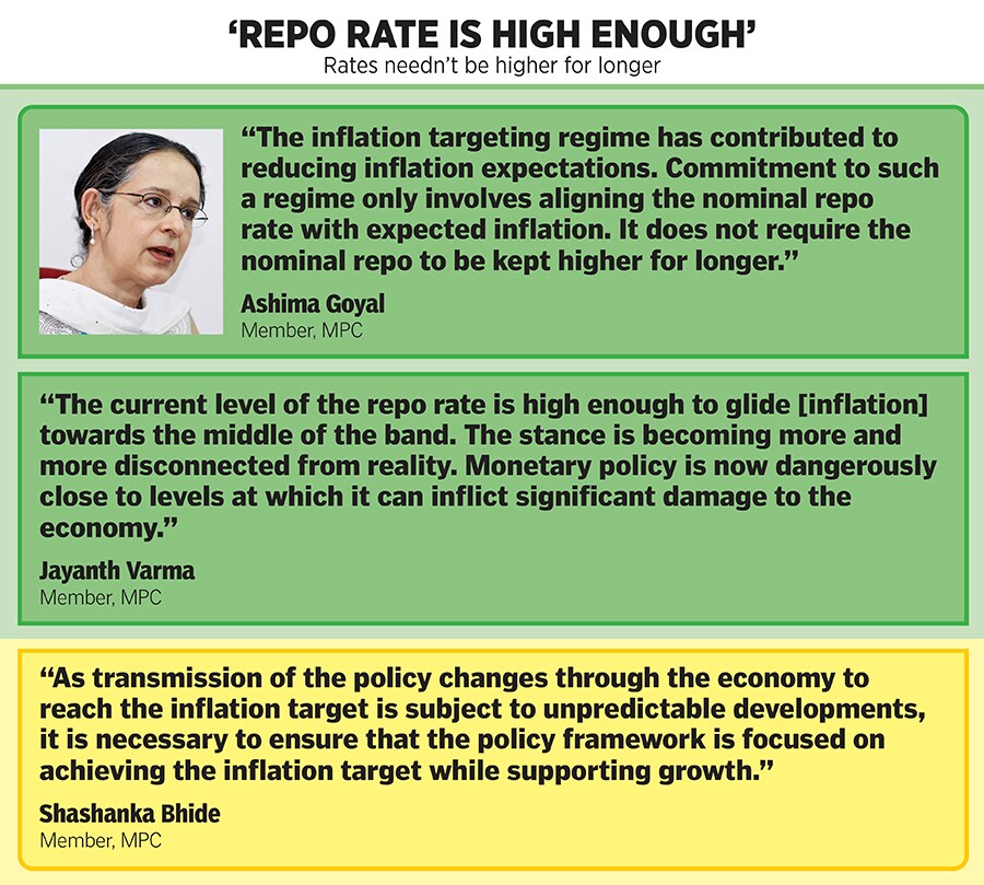 Also, in contrast to most members, Bhide isn’t as worried about the impact of extreme weather conditions on food prices. “The normal monsoon forecast by the Indian Meteorological Department, despite the emergence of the El Nino phenomenon, would be supportive of agricultural growth," he says. He adds that the impact of increase in policy rate between May 2022 and April 2023 by 250 basis points and other economic policy measures have been crucial in anchoring price expectations. “As transmission of the policy changes through the economy to reach the inflation target is subject to unpredictable developments, it is necessary to ensure that the policy framework is focused on achieving the inflation target while supporting growth," he notes.