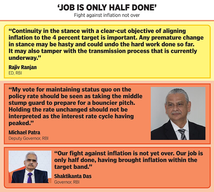 The three RBI members, Rajiv Ranjan, Michael Patra and Shaktikanta Das, aren’t as optimistic and feel the pause in rate hikes doesn’t necessarily indicate an end in the rate hike cycle.