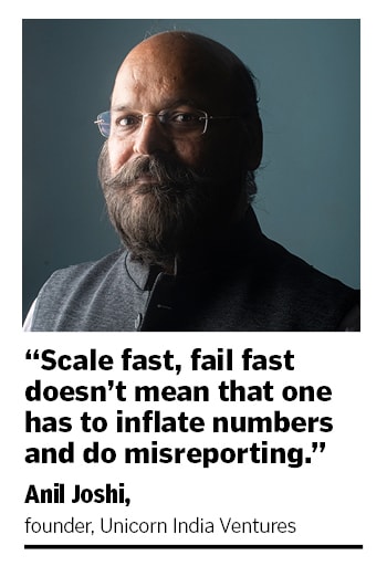 Anil Joshi explains why it would be unfair to blame the VCs. “Scale fast, fail fast doesn’t mean that one has to inflate numbers and do misreporting," says the founder of Unicorn India Ventures, a venture fund backing early-stage startups. VC money, he underlines, has to be used to grow and not indulge in malpractices. “I can understand that one has to live up to the valuation but do all startups indulge in financial irregularities?" he asks. “If not, then why blame the VC model?"
