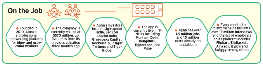 But that’s precisely who he is, Parikh says. He has a penchant for solving problems and that’s precisely why investors are flocking to invest in his latest venture, Apna, a two-year-old professional networking platform for blue- and grey-collar workers, that raised $70 million in a funding round led by US-based investors Insight Partners and Tiger Global on June 16. Apna is currently valued at $570 million, up five times from its previous round three months ago when it raised $12 million. Until now, the company has received a total of $90 million from existing investors.