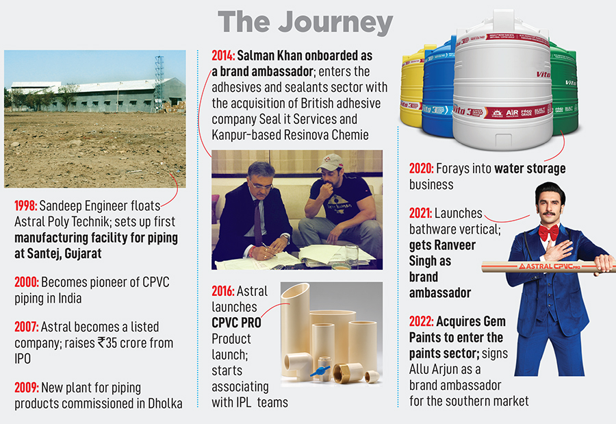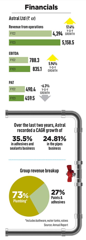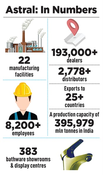 Though a late entrant in the bathware category, the Engineers are bullish about the potential in this space, despite it being a consumer-facing segment. Since getting into the category in 2021, Astral already has 383 bathware showrooms and display centres. “The vision was to expand the brand. End-users never saw the Astral brand name. Now, with bathware in place, they do… so we are moving closer to our consumer and getting connected," says Sandeep Engineer, chairman & managing director, Astral Limited.