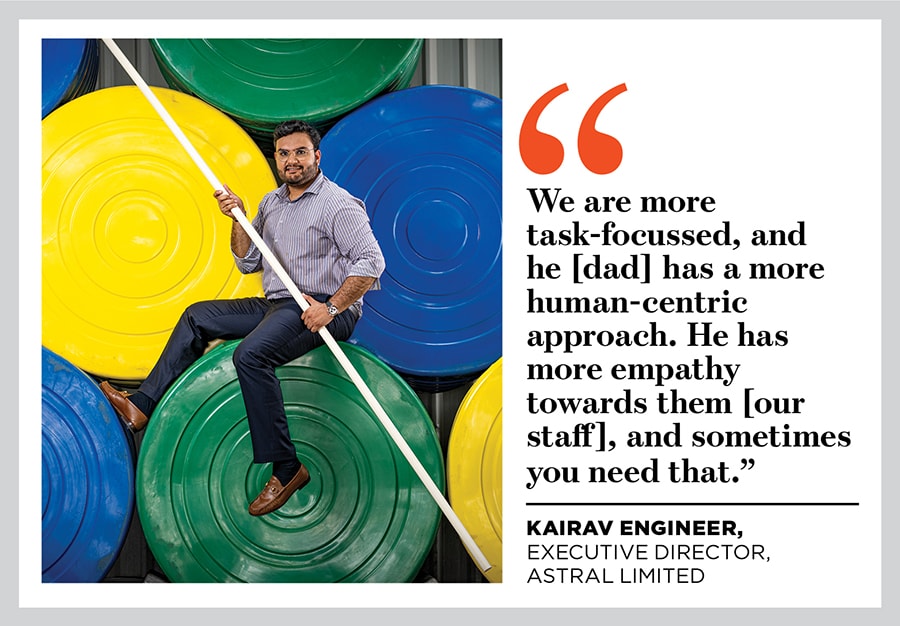 He continues to lead the mammoth company that Astral is today, but it’s his sons—Kairav and Saumya Engineer—who are running the show on ground. Sitting in a boardroom at Astral’s head office in Ahmedabad, Engineer says with a laugh, “Sometimes we have arguments, but 90 percent of the time we are in the safe zone. Over the years, I have learnt how to delegate. It is tough for me because I started and then grew the business and every nitty-gritty was handled by me."