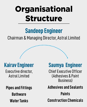 Though Kairav and Saumya are hands-on, bringing in a lot of changes, Engineer continues to remain the people-person he always was—be it with his staff or distributors. “I have been a distributor for Bengaluru with Astral since 1999. Sandeep Engineer is a chemical engineer, and knows how to maintain the quality of all his products. In all these years, Sandeep sir has been extremely accessible for any issues I face, and now his sons are taking that legacy forward," says K Srinivas, distributor, Astral.