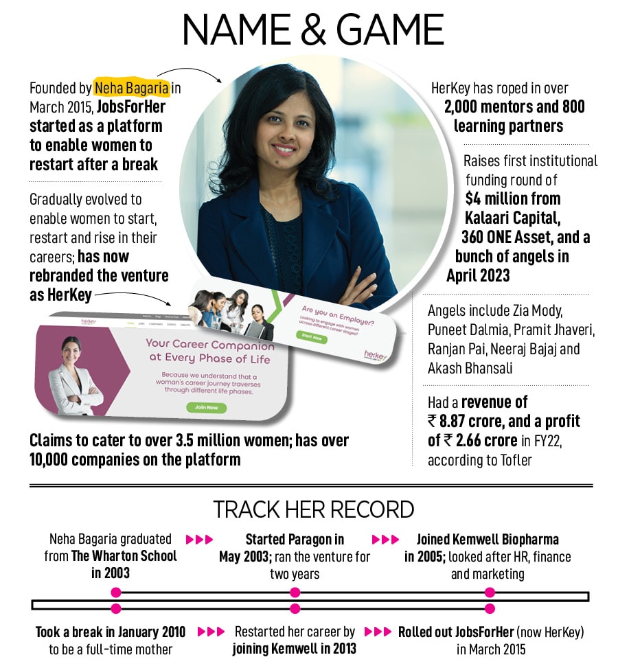 Fast forward to April 2023. After eight years of toil, patience and a bootstrapped journey, Bagaria has raised her first institutional funding round of $4 million from Kalaari Capital, 360 ONE Asset, and a bunch of angels such as Zia Mody, Puneet Dalmia, Pramit Jhaveri, Ranjan Pai, Neeraj Bajaj and Akash Bhansali. JobsForHer, which is now rebranded as HerKey to denote a change in the positioning of the company which has emerged as a career-engagement platform for women and is not just confined to the ones returning to the job market, has added enough heft as well. HerKey, claims Bagaria, caters to over 3.5 million women, has over 10,000 companies on the platform, and has roped in over 2,000 mentors and 800 learning partners. Though she declines to share the financials of the company, data shared by Tofler says the venture had an operating revenue of Rs 8.87 crore and a profit of Rs 2.66 crore in FY22.