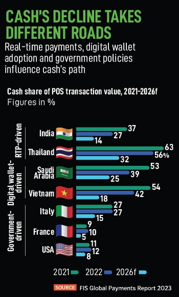Acceptance in India also took a few years to play out—between 2016 and 2019. Digital payments are not likely to slow down any time soon. There are clear signs too that the usage of cash in the Indian economy is starting to slow down (see infographic).