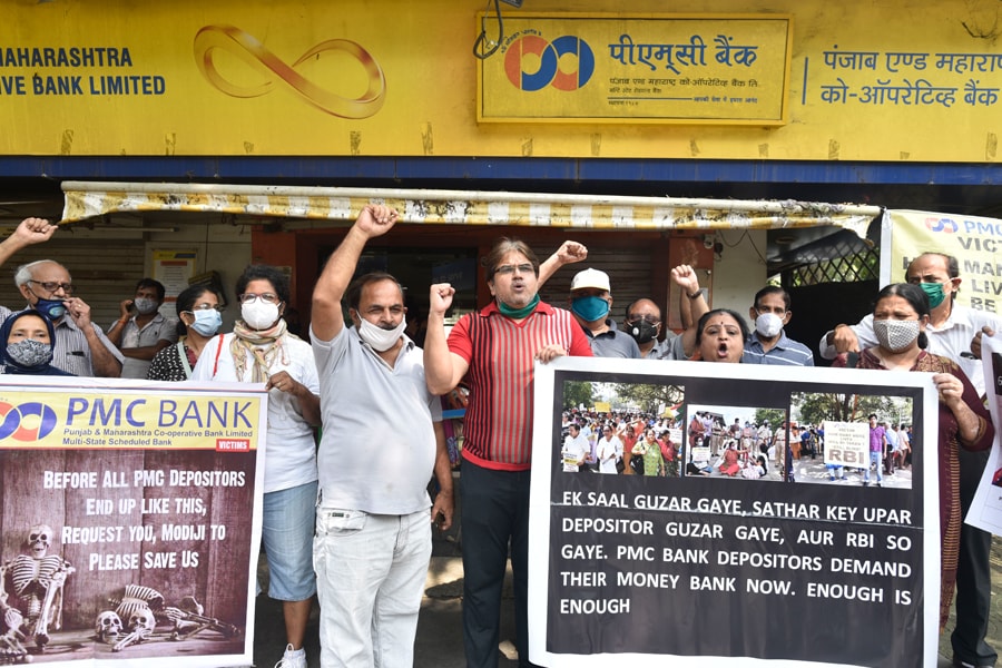 PMC Bank depositors protest outside PMC bank at Poonam Nagar, Andheri, on October 9, 2020 in Mumbai, India. Photo by Satyabrata Tripathy/Hindustan Times via Getty Images[br]