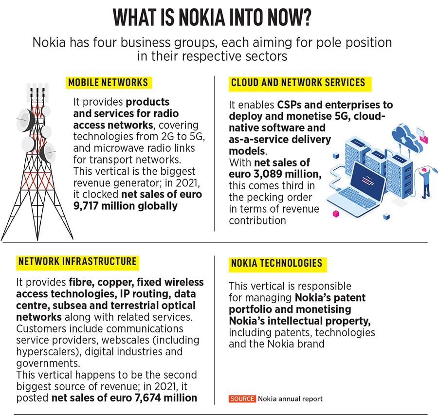 The reinvention of Nokia, reckon telecom and industry analysts, has indeed made it a force to reckon with globally. Over the last decade, Nokia restructured and carved out four distinct business groups, each aiming for pole position in their sectors. First is ‘mobile networks’—the biggest revenue generator for Nokia. This division provides products and services for radio access networks covering technologies from 2G to 5G, and microwave radio links for transport networks.