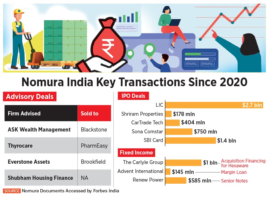 Like most of the financial firms on the street, Nomura too clocked all-time high numbers for its India business last year. Since the pandemic, it has been appointed as merchant bankers for 14 IPOs including the $750 million (Rs5550 crore) IPO of automotive firm Sona Comstar, an automotive supplier firm backed by Blackstone. Since 2017, it has participated in over 51 equity capital markets (ECM) transactions to raise close to $23 billion for its clients. Since 2020, Nomura has closed 13 M&A deals across sectors with a balanced contribution of sell-side and buy-side M&A transactions, the most notable ones being the sale of ASK to Blackstone, the purchase of Eureka Forbes by Advent and the sale of Thyrocare to PharmEasy. Since 2020, it has closed over 20 deals under its debt financing vertical to both financial sponsors and corporate clients. This includes a $1.1 billion fundraise for a global private equity fund for financing its buyout transaction. Nomura also participated in raising $1 billion for The Carlyle Group for the acquisition finance of Hexaware.
