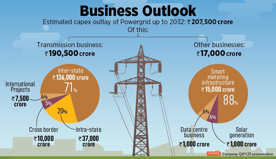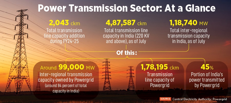 The public sector utility, which transmits 45 percent of India’s power and controls around 84 percent of the inter-regional transmission capacity in the country, added 91 ckm transmission lines during the quarter ended June, as per the company’s investor presentation in June. It announced an estimated capital expenditure outlay of Rs207,500 crore up to 2032, out of which Rs190,500 crore will go to the transmission business, and around Rs17,000 crore to solar generation, smart metering infrastructure and data centres.