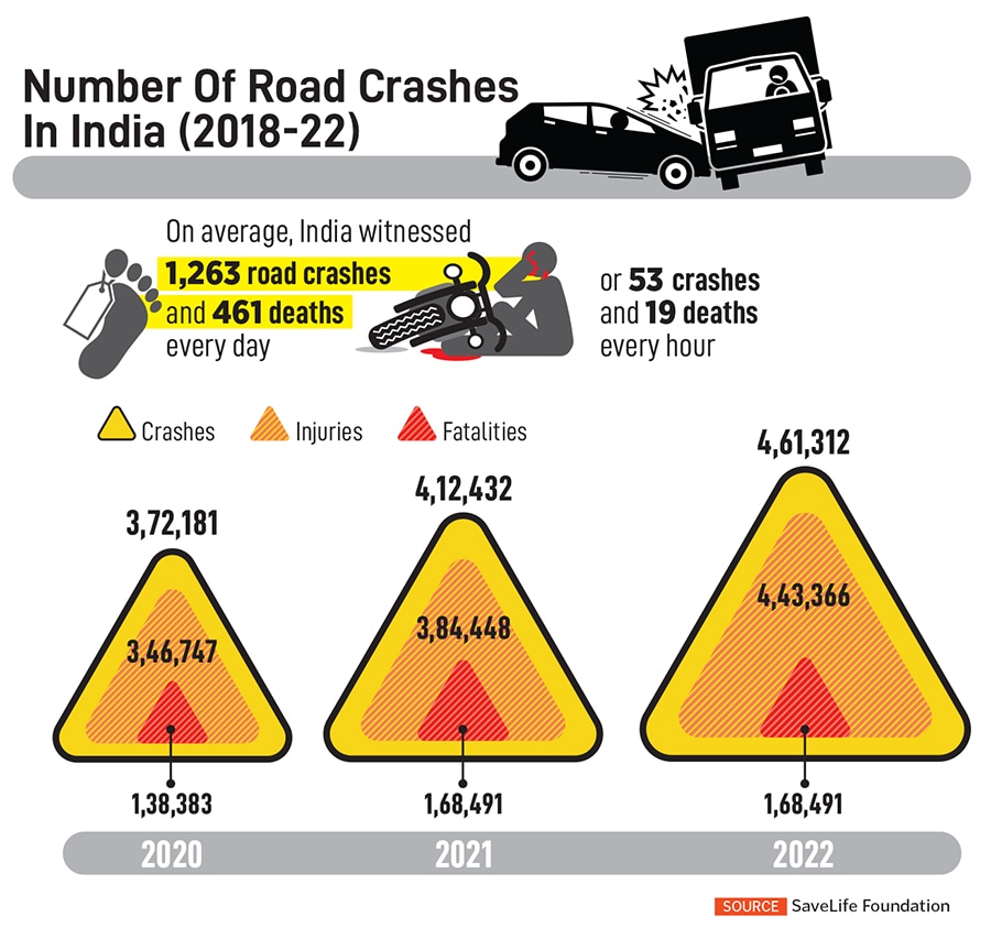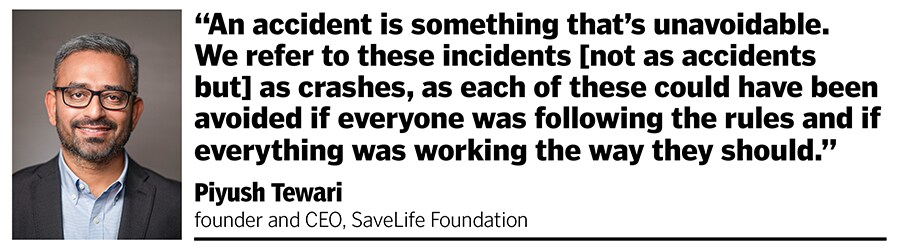 “There is no such thing as an accident." While that statement might bring to mind the character of Oogway, from the 2008 film Kung Fu Panda, it is now being said by Piyush Tewari, founder and CEO of SaveLife Foundation. “An accident is something that is unavoidable. We refer to these incidents as crashes, like the aviation industry does. This is because each of these incidents could have been avoided, if everyone was following the rules and if everything was working the way they should." Tewari highlights several reasons behind road crashes in India. Chief among them are speeding, driving on the wrong side, drunk driving, use of mobile phones while driving and jumping red lights.