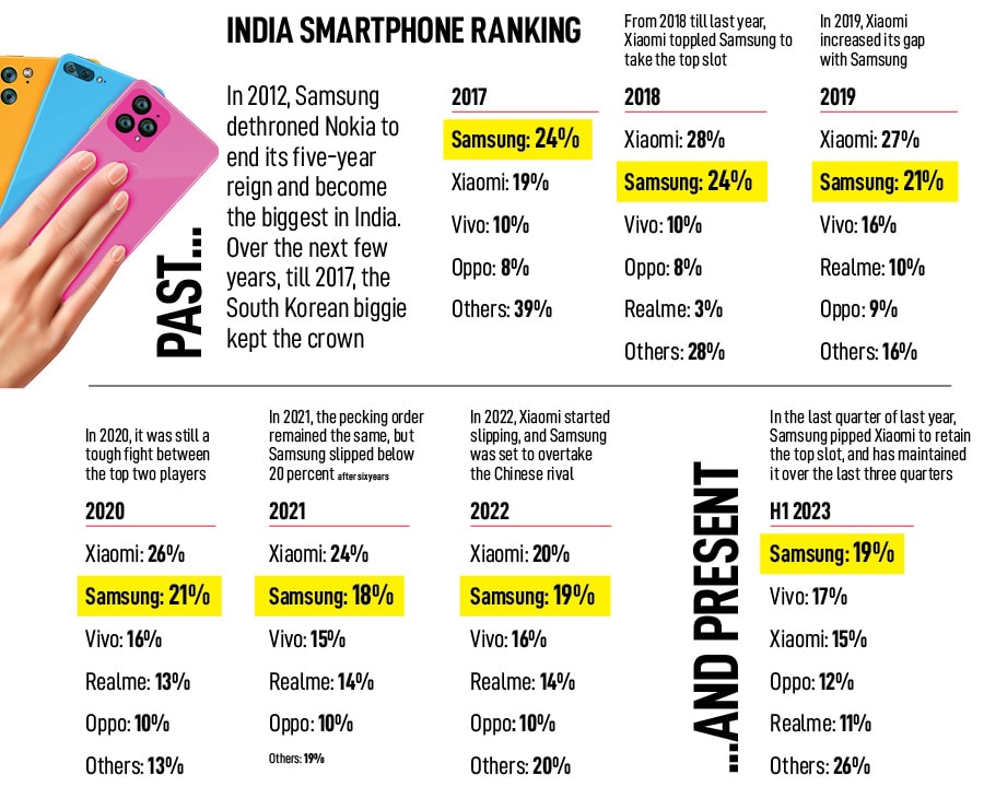 Back in 2018 in India, it was the right question to ask. JB’s familiarity was not of much use. India was no longer the land of Nokia. Though Samsung, which started operations in India in 1995, toppled the Finnish handset major to lead the Indian market with a thumping 33 percent market share in 2012, a bunch of homegrown and foreign players were fast emerging as potent challengers. In 2012, Micromax had cornered 8 percent of the market and was third in the pecking order after Microsoft. With a differentiated product and positioning, BlackBerry too was coming up as a serious threat and had 6 percent share, according to data shared by global mobile and technology market research firm Counterpoint. Fifth in the stacking was Karbonn, another desi player with a 5 percent share.