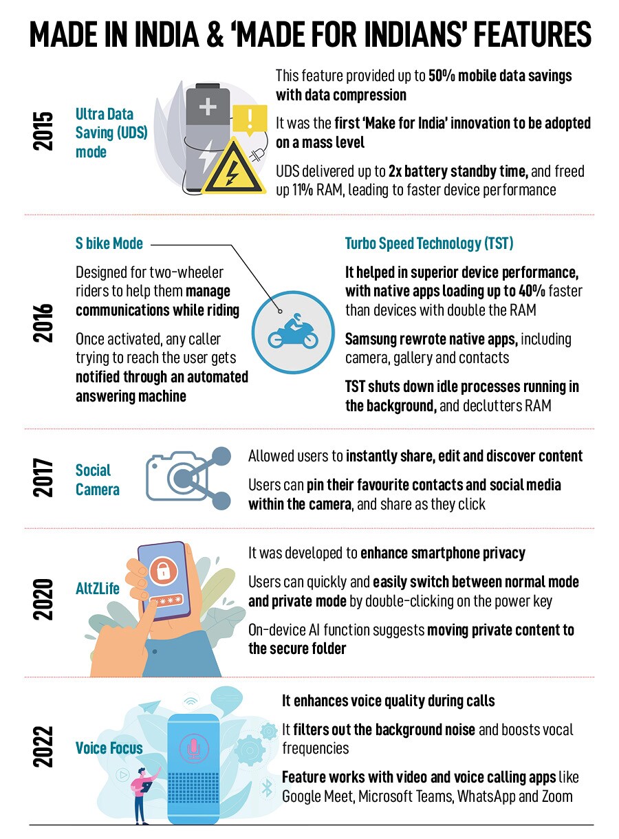 In handsets, Samsung’s superpower comes from two factors. First, it straddles across price points: From mass to class—from under Rs10,000 to above Rs1 lakh, there is something for everybody. Second, the brand has always pressed the innovation pedal (see box). From Voice Focus (to enhance the quality of voice) to AltZlife (to enhance privacy) to ultra-data saving mode and social camera, Samsung has stayed ahead of the curve, reckons Tarun Pathak, research director at Counterpoint.