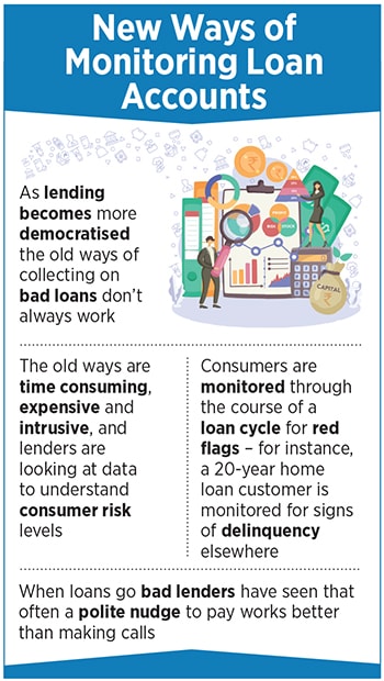 Lenders have seen old collection methods failing. Outsourcing to a collection agency brings in sub-optimal results. At Rs1200 the cost of sending an agent may not be worth it when collecting on a personal loan payment of Rs2000. At the same time financial institutions realise they cannot be good lenders unless they learn to collect efficiently. Warning signs have to be picked up and consumers have to be nudged to make payments. This is painstaking work that is often outsourced and best done through the use of technology.