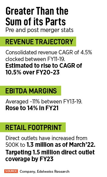 Results are proof: Revenue from operations grew to Rs 12,425 crore in FY22, up seven percent from the previous fiscal. Earnings before interest, taxes, depreciation and amortisation (EBITDA) also rose by 11 percent to Rs 1,749 crore in FY22. Moreover, the company averaged an EBITDA margin of around 11 percent between FY13 and FY19. Post the merger, TCPL’s margin has risen to 14 percent in FY22 and is expected it to rise by another 300 bps by FY23, according to Abneesh Roy, head of research at Edelweiss Financial Services.