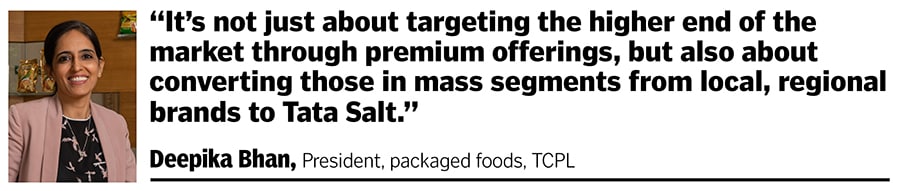 But it also launched a slew of other salts in the last two years—Tata Salt Super Lite, a 30 percent low sodium salt, to cater to increasingly health-conscious consumers Tata Salt Immuno, a zinc fortified salt that is currently being piloted in Delhi and Shuddh by Tata Salt, a mid-tier portfolio play for the Southern Indian markets where the preference is for solar salt as opposed to the regular vacuum evaporated salt. “So it’s not just about targeting the higher end of the market through premium offerings, but also about converting those in mass segments from local, regional brands to Tata Salt and its variants," explains Deepika Bhan, president, packaged foods, TCPL.