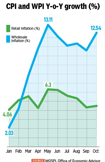 The rise in core inflation—which excludes food and fuel—is a big concern. The central bank largely uses consumer surveys to gauge inflation, and expects CPI or retail inflation to peak at 5.7 percent in the fourth quarter of the current fiscal [Exhibit 2]. But, the wholesale price index (WPI) basket [Exhibit 3]—comprising over 55 percent non-food items—was burning red hot at 12.5 percent in October, and crossed the double-digit barrier for the first time in April [Exhibit 4]. Raghuram Rajan, former RBI governor, had replaced the use of the WPI with the CPI for setting the benchmark rate.