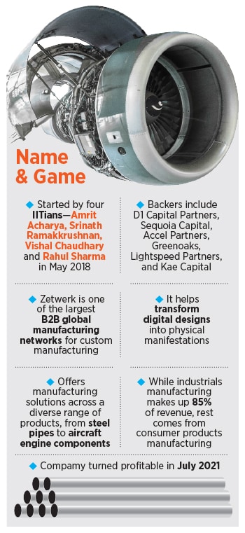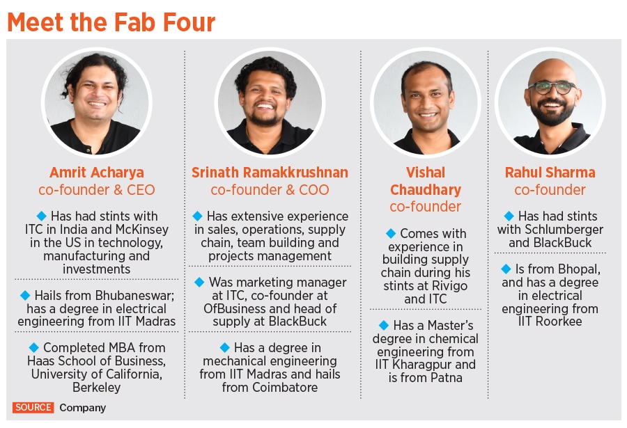 A few months down the line, the same old question—unknown, risk and opportunity—shadowed Acharya. Along with his three IIT friends—Srinath Ramakkrushnan, Vishal Chaudhary and Rahul Sharma—Acharya started Zetwerk in May 2018 as a B2B software venture that was designed to help companies manage supply chains. With Zetwerk, a Dutch word meaning strong foundation, the co-founders managed to get the term sheet for the seed round of investment of $1.5 million [around Rs11 crore*] in the first month itself.