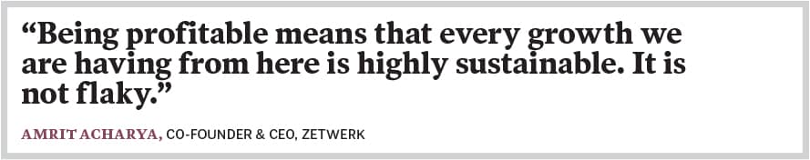 Acharya explains that the tag of being a profitable company is more valuable than being called a unicorn, because every bit of growth Zetwerk experiences hereon will be sustainable. Posting profits also means the company will have control over fundraising. “It is a choice in my hands," Acharya says, adding that the velocity at which the company has grown over the past three years makes it stand out. “We have been running a marathon and a sprint," he smiles.