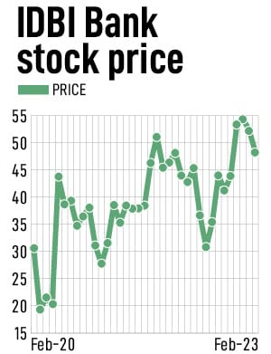 IDBI Bank has a market cap of Rs52,095 crore (as of February 23), with the stock price of Rs48.25 at the BSE. The stock found momentum from the 2022 low of 30.8 to rise 55 percent to Rs48 levels, but tends to slide on profit taking after all disinvestment-related news. IDBI has thus fallen 18 percent from its January 2023 high of 59 and now trades just 6 percent up from the Rs45 level a year ago.