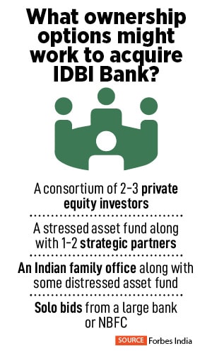 The possibilities that a private equity investor will form a consortium with other partners, or a stressed asset fund may combine with a strategic partner, are likely options. A local Indian family office could also join hands with a distressed asset fund (see table). “A number of them are talking to each other. There is phenomenal value in IDBI Bank, but to extract it is not easy," says the bank source.