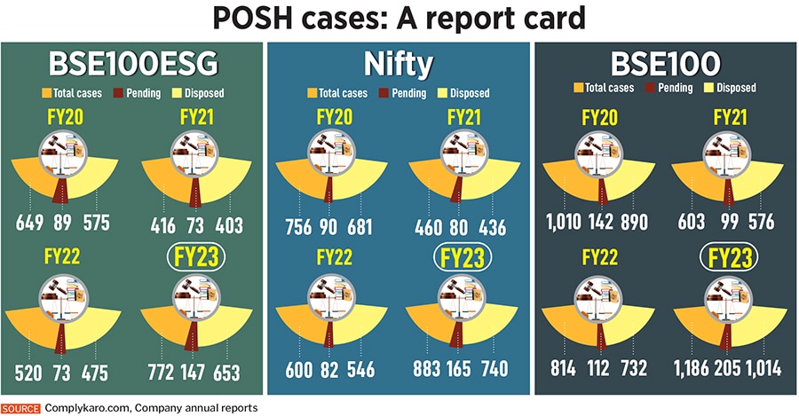 According to Swati Agrawal, CEO, CareEdge Advisory and Research, if a company has a high number of pending Posh cases, it may indicate potential gaps in effective implementation of its Posh policies. “This could adversely impact the company’s performance on social indicators on labour and human capital management. However, it needs to be also evaluated on the timelines taken to resolve these cases. A higher number of such incidents being reported can also be construed as a step towards transparent disclosures of labour management practices. Resolving them in a time-bound manner is a critical input," says Agrawal.