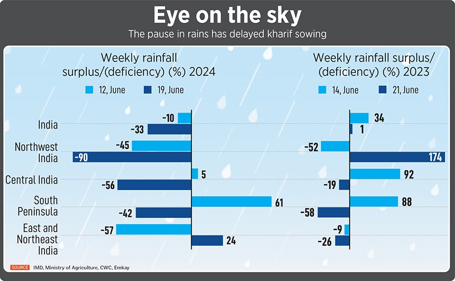 After a good start, the 'pause' in rains across most regions has led to a delay in the sowing of kharif crops, stoking concerns of food inflation and higher-for-longer interest rates