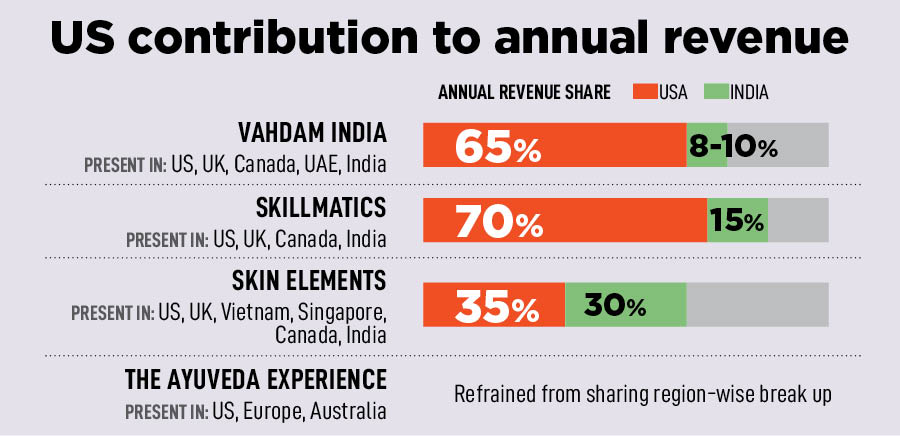The Ayurveda Experience, which started operations in 2014 as an ayurveda content platform, started selling serums and cleansers in the US and Australia. And men’s hygiene player Skin Elements gets more than 60 percent of its revenue by selling in the US.