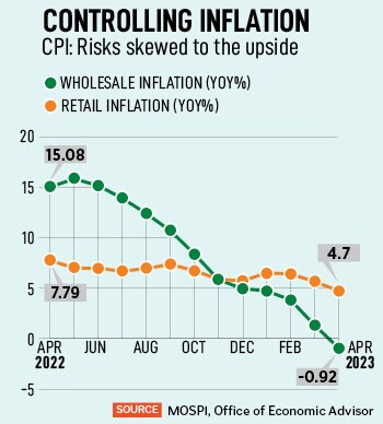 The latest consumer price index (CPI) inflation at an 18-month low of 4.7 percent was mainly due to a favourable base. Goldman Sachs expects the RBI to revise its inflation forecast for FY24 to 5 to 5.1 percent from 5.2 percent, but cautions that upside risks persist. “Delayed onset of monsoon and voluntary production cuts announced by OPEC members to support crude oil prices might exert upward pressure on commodity and domestic food prices," Sengupta adds.