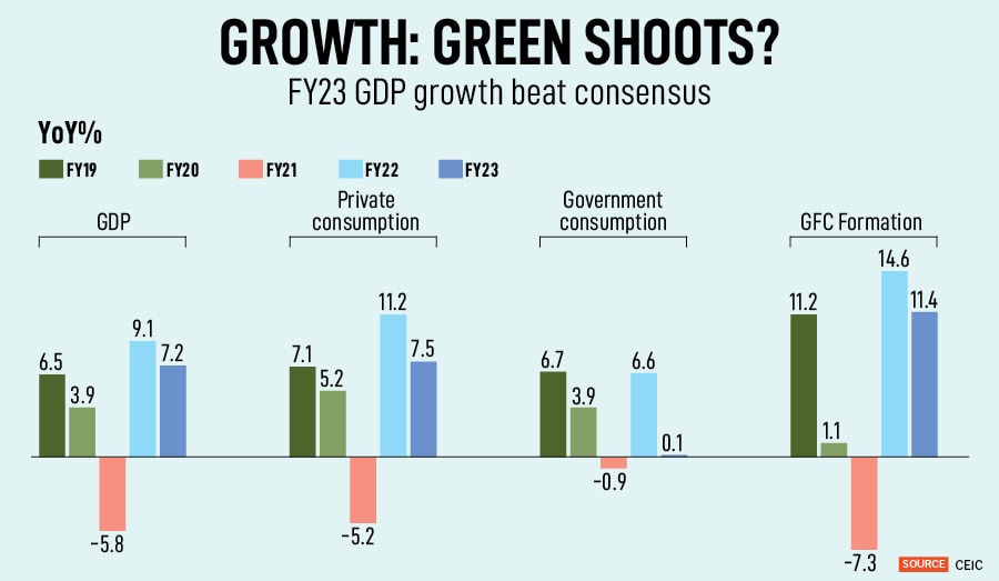 The Reserve Bank of India’s (RBI) year-long battle to rein in inflation—within its target of 4 percent with a margin of plus or minus 2 percent—has borne results for weary policymakers. In April, retail inflation cooled off to 4.7 percent from 7.8 percent in the year-ago period. To control inflation, in FY23, the benchmark interest rate was raised by 2.5 percentage points, and this exerted a toll on growth. But a GDP growth rate of 6.1 percent in the January to March period sprung an unexpected surprise as it beat market estimates and pushed growth to 7.2 percent for FY23.