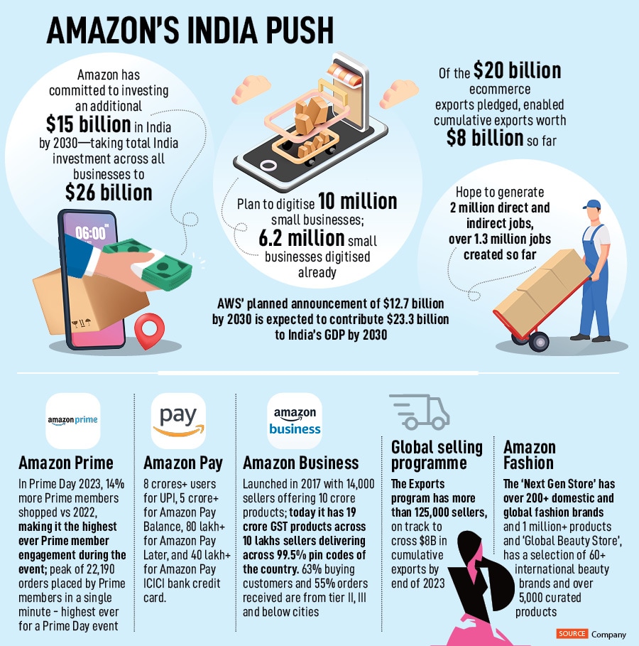 Amazon’s $26 billion investment in India will focus on goals including increasing exports, digitisation of small businesses, and generating employment. “We pledged to digitise 10 million small businesses enable $20 billion in ecommerce exports, and create two million direct and indirect jobs," Tiwary says. Of this, Amazon claims to have digitised over 6.2 million small businesses already, enabled exports worth $8 billion, and created over 1.3 million direct and indirect jobs in India. Of its total investment, AWS’ planned announcement of $12.7 billion by 2030 is expected to contribute $23.3 billion to India’s GDP by 2030.