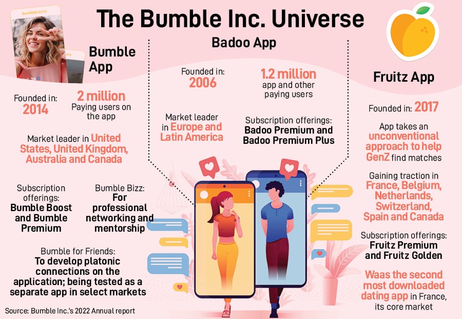 The Badoo app—founded in 2006 and now part of Bumble Inc—is also a dating application with close to 1.2 million app and paying users, as on December 2022. It is a market leader in Europe and Latin America, as per the company’s 2022 Annual report. Andrey Andreev, founder of Badoo, was one of the main investors of Bumble. In 2019, he sold his entire stake in MagicLab (the company that owned both Bumble and Badoo) to Blackstone. Andreev then stepped away from the business, and Wolfe Herd, Bumble’s founder became the CEO of the company, now known as Bumble Inc. In January 2022, Bumble Inc acquired Fruitz, a fast-growing dating app with a Gen-Z focus. It was the second most downloaded dating application in France in 2022.