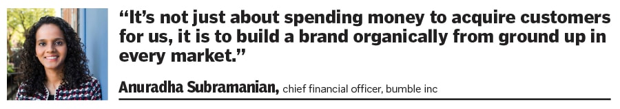 The US continues to be a large market, but Anuradha Subramanian, chief financial officer, Bumble Inc says, “international growth is a big pillar of our growth strategy." Bumble has been seeing a lot of traction from Western Europe, Latin America and India is increasingly becoming a critical market. For every market, Bumble comes up with a unique marketing strategy, which is always in line with the local dynamics of that particular market. “It’s not just about spending money to acquire customers for us, it is to build a brand organically from ground up in every market," she adds.