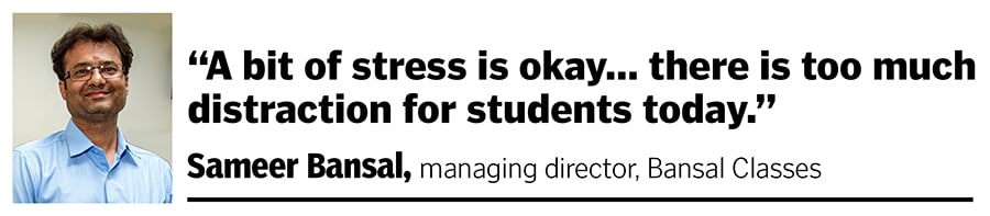 Meanwhile, a seasoned teacher reckons that stress—obviously in small doses—acts like a catalyst. “A bit of stress is okay," says Sameer Bansal, managing director of Bansal Classes, the first and the oldest coaching institute of Kota. The second-generation entrepreneur, who joined the profession as a teacher in 2001 and started taking care of the administration from 2015 onwards, underlines that studies alone can’t be held responsible for the rising stress. “There is too much distraction for students today," he says. “They are also a pampered lot by the parents," he says, adding that teachers don’t even scold students at the classes. Underlining the fact that physics, chemistry and maths haven’t changed for decades, Bansal reckons that hyper-competitive exams—IIT happens to be the toughest in India—will be gruelling. “We need to focus on the inner strength of the students," he says. “They need to be mentally strong."