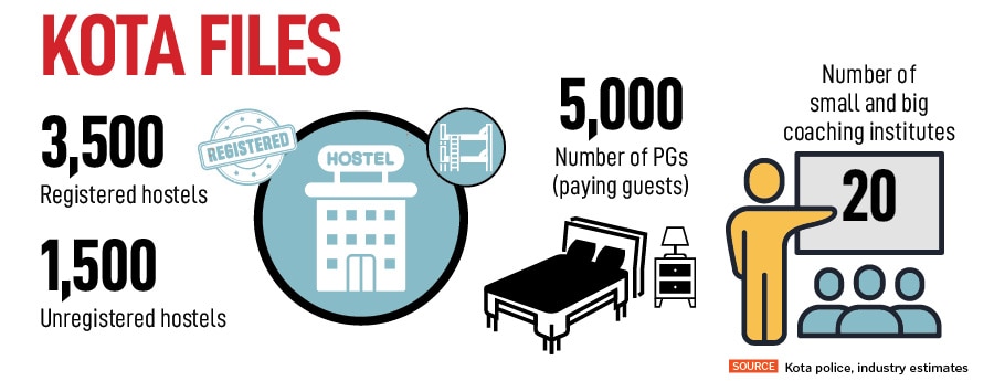 Meanwhile, the police patrolling team at Indra Vihar finds a girl who is torn between expectations and reality. Sanju Sharma, assistant sub-inspector with Kota Police, and Narayan Lal Suman, a 49-year-old head constable, visited one of the hostels—there are around 3,500 ‘registered’ hostels in Kota, an estimated over 1,500 are running without registration, and over 5,000 PGs (paying guests)—and starts talking to the girl who had called the students’ cell helpline. Both the police officials easily go unnoticed by any of the locals or owners of the shops that have mushroomed along the line that has a bunch of only girls’ and boys’ hostels. Suman explains how they remain invisible. “We don’t come in police vans, and we are not in our uniforms," he says. “The idea is not to be intimidating."