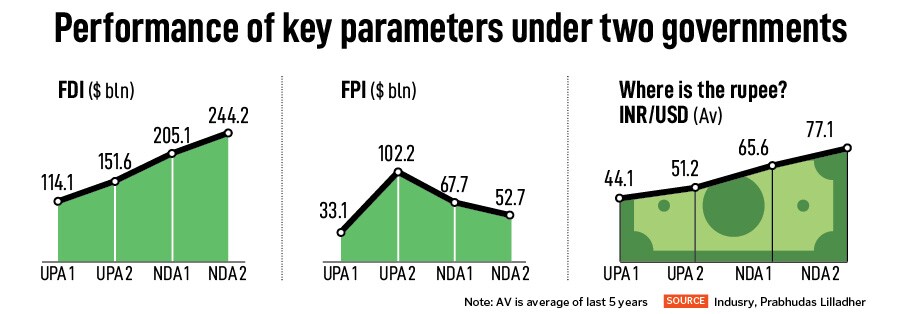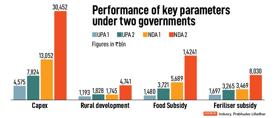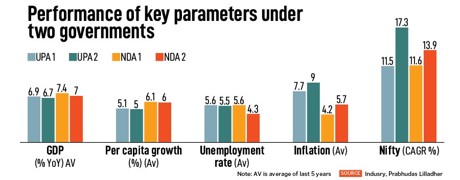 Amnish Aggarwal, director, institutional research, Prabhudas Lilladher, feels the economy and markets have done well under both the NDA and UPA governments, given strong tailwinds of demographics. However, the NDA scores in implementing key reforms and its focus on Infra development and inclusive growth across sections and regions.