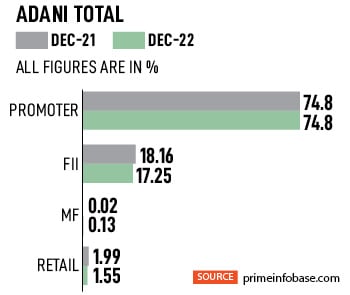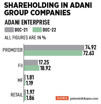 Shareholding pattern of listed Adani group companies is simple. All the seven key Adani group companies listed on the stock exchanges are promoter-led with minimum public float. Except Life Insurance Corporation of India (LIC), institutional investors are missing while retail participation is visible in a few companies. According to the Securities and Exchange Board of India (Sebi), a listed company should have minimum public shareholding of 25 percent while newly listed ones are granted three years to meet the requirement of 25 percent public float.