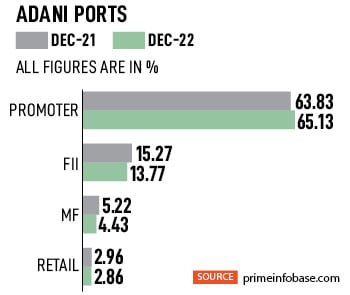 Mutual funds participation is highest in Adani Ports by the end of the December quarter (4.43 percent), though that segment has reduced from a high of 5.22 percent in December year-ago period. FIIs ownership stands at 13.77 percent, consistently reducing from 17.53 percent in March 2020, while promoter ownership has risen to 65.13 percent at the end of the December quarter from a low of 62.79 percent in March 2020.
