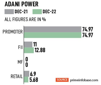 As per the latest shareholding pattern declared to the stock exchanges, retail investors are highest in Adani Power with 5.68 percent in December-end. However, this segment has seen a fall from 6.9 percent in the December quarter of 2021. Retail investors are defined as individuals with up to Rs2 lakh shareholding in a company. Mutual funds have nil investment in Adani Power, while foreign institutional investors (FII) holding is at 12.88 percent which has also reduced from 13.23 percent in the September quarter of 2022.