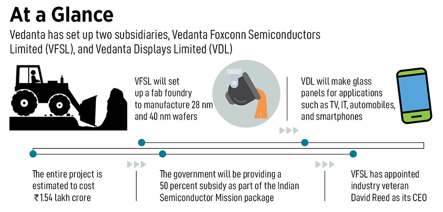 Today, it’s that decision that has given Vedanta enough ammunition to try and build India’s first semiconductor and glass display manufacturing facility. It has set up two subsidiaries, Vedanta Foxconn Semiconductors Limited (VFSL), which will set up a fab foundry to manufacture 28 nanometre (nm) and 40 nm wafers (slices of semiconductor material used to make integrated circuits), and Vedanta Displays Limited (VDL) that will make glass panels for applications such as TV, IT, automobiles and smartphones.