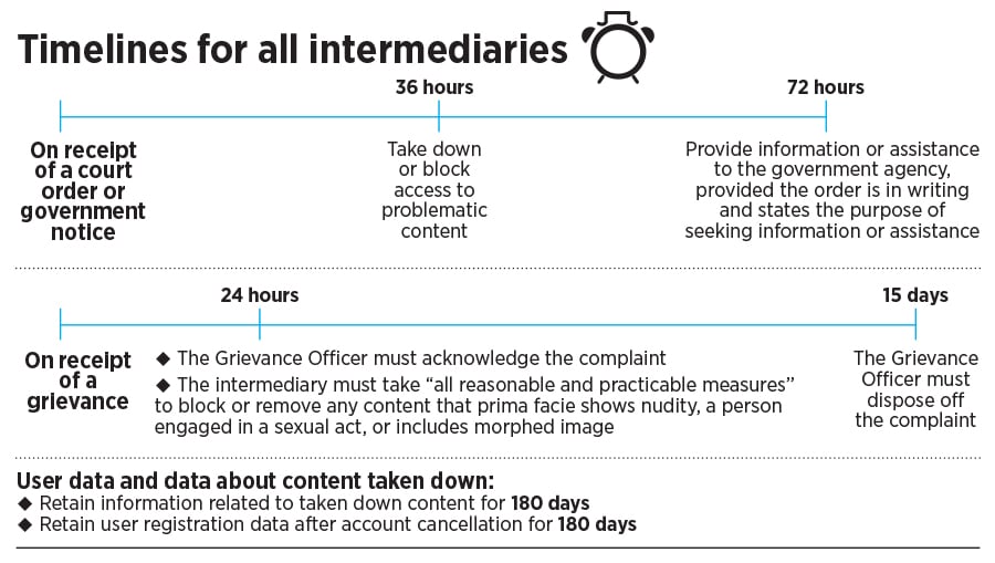 For Roy, complying with deadlines—72 hours for information requests, 36 hours for content takedowns, 24 hours for content showing nudity without consent—is a realistic and attainable goal for the intermediaries. “These timelines have been given after due consultation with these platforms and deliberating on the reasonableness of them because ultimately they have to enforce them," he says. In most cases, the intermediaries comply with the content takedown deadlines, he adds.