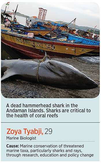 Marine biologist Zoya Tyabji is an expert on sharks, an apex predator of the sea and one of the oldest life forms on Earth which evolved more than 400 million years ago or 200 million years before dinosaurs. She spent her summers growing up at the beach in Kihim, Alibaug. “I realised that the ocean is my therapy—it inspires and relaxes me. Over the years, I also saw it erode through tourism and industrialisation. This brought out an emotional commitment to dedicate my life through education and deep research to defending it," she says. At 25, Tyabji became fascinated with sharks while working on coral reef resilience in the Andaman Islands. She often heard that sharks play an important role in the health of reefs, and so she was surprised when she did not see any. And yet several reefs were called ‘healthy’. The local communities informed her of steep declines in sharks due to overfishing. “I wrote a grant for funding and led a study on sharks by visiting fish landing sites, aided by my team member and with my supervisors mentoring me. My experiences motivated me to pursue a PhD to build more information and awareness about sharks," she says.