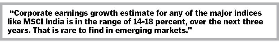 I think for the time being, investors around the world are willing to pay the high valuations for relative stability. Not just stability in terms of economic growth, but also corporate earnings growth, even though Indian markets have suffered a degree of earnings estimate downgrade. Still, corporate earnings growth estimate for any of the major indices like MSCI India is in the range of 14-18 percent, over the next three years, which is rare to find in emerging markets. You would have a much higher degree of volatility in North Asia and pockets of South Asia. We think this combination of earnings estimate volatility and turmoil in North Asia due to demand retrenchment in developed markets is what’s giving India an aura of relative stability.