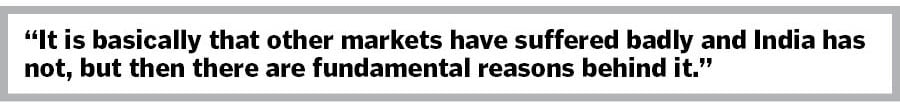 I would say Indian investors are used to 15-20 percent growth. In a year like this, if you have 4-5 percent nominal growth in local currency and maybe minus 5 percent growth in US dollar terms, that"s a superb outcome. Markets in Hong Kong, China and Taiwan are down 30-40 percent.