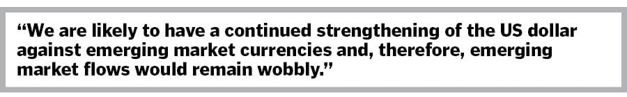 India suffered between October 2021 and July 2022, when about USD 33.4 billion were taken out of India. Since then, we have seen some recovery — it has still been wobbly. Not only is the US Federal Reserve hiking rates rapidly, much sharper than what we anticipated earlier, but it is also in the midst of an aggressive round of quantitative tightening. It is much more stringent than what we had seen in the round of quantitative easing in 2018. In this context, we are likely to have a continued strengthening of the US dollar against emerging market currencies and, therefore, emerging market flows would remain wobbly.