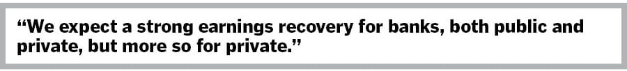 We expect a strong earnings recovery for banks, both public and private, but more so for private. Where"s that coming from? Two reasons. We are seeing loan growth, non-food credit growth — now about 15 percent — driven largely by consumption, possibly urban consumption. But at some point — maybe not now, maybe a year later — even the private capex cycle should kick in. So that"s one sector that is almost 30 percent of the market.