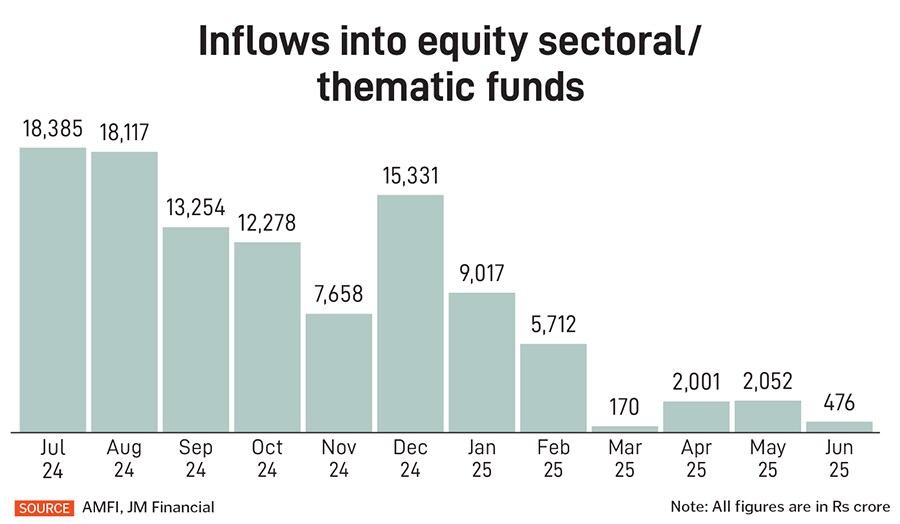 Looking at it from a larger perspective of investor sentiment, net inflows into overall thematic and sectoral funds have also declined, slipping to ₹476 crore in June, shows AMFI data. This compares to a net inflow of ₹2,052 crore in thematic and sectoral funds in May and a whopping ₹18,386 crore in July last year.