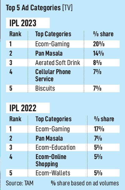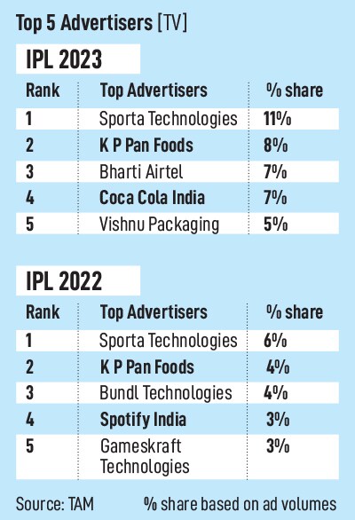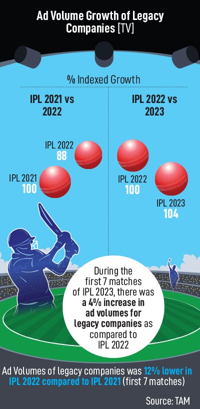 During the first seven matches of the tournament, TAM recorded a 4 percent increase in ad volumes for legacy companies as compared to IPL 2022, while the volumes last year were 12 percent lower against those in IPL 2021.