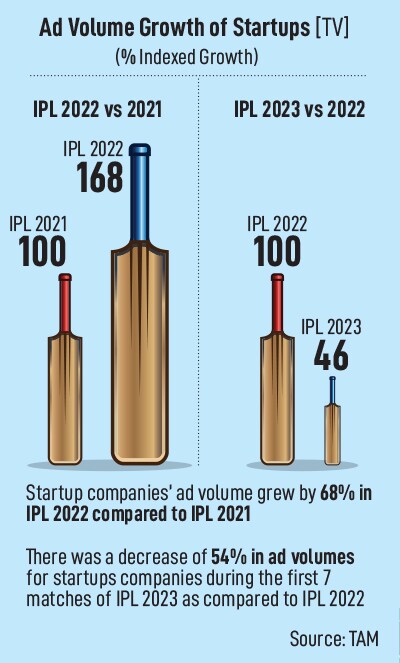 If the economic slowdown has indeed left its footprint on the IPL, it’s in the way in which startups have invested in the 2023 edition. As TAM data indicates, ad volumes for startups have decreased by over 54 percent during the first seven matches of IPL 2023, as compared to the previous year—in IPL 2022, on the other hand, the volume had risen by 68 percent in comparison to 2021.