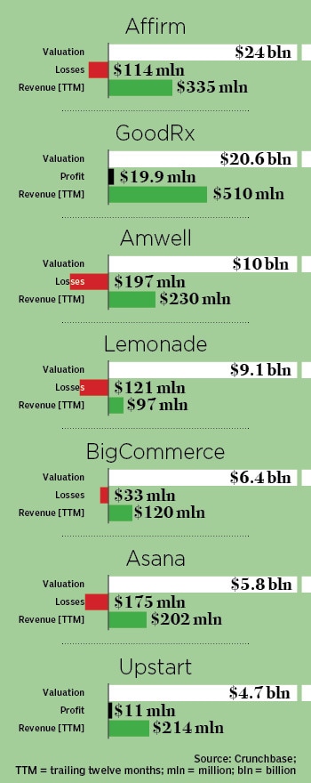 America’s love with loss-making tech companies remain unabated to this day. In February, Crunchbase looked at 12-month earnings for a sample of 12 venture-backed public companies that got listed in 2020. While three-fourths posted losses in excess of $100 million, companies with the highest revenue also posted some of the largest losses [See box ‘Report Card: Global Tech Companies Listed in 2020’)