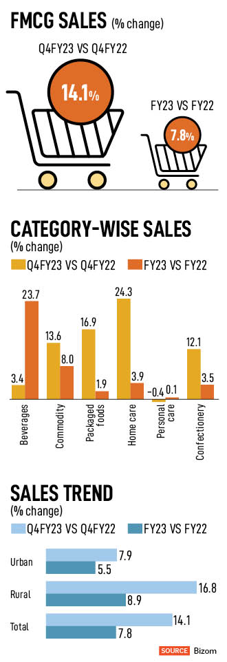 Overall, FMCG sales, urban and rural combined, grew by 14.1 percent in Q4 and 7.8 percent in the full year, Bizom said.
